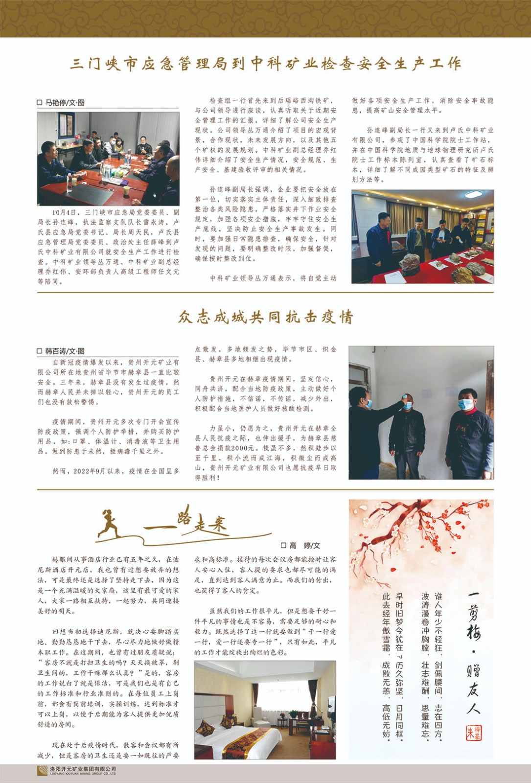 洛陽開元礦業(yè)集團(tuán)有限公司簡(jiǎn)介洛陽開元礦業(yè)集團(tuán)有限公司,始成立于2006年,位于洛陽市開元大道269號(hào)。集團(tuán)旗下共有五余家全資子公司,業(yè)務(wù)涉及有色金屬礦山開發(fā)、礦產(chǎn)品購銷與進(jìn)出口貿(mào)易、房地產(chǎn)開發(fā)、文化藝術(shù)、企業(yè)管理與咨詢、資本投資等多個(gè)領(lǐng)域。民建河南省委委員、民建河南省委企業(yè)委副主任、民建洛陽市委委員、企業(yè)委主任、洛陽民建企業(yè)家協(xié)會(huì)會(huì)長(zhǎng)許明月是公司創(chuàng)始人,現(xiàn)任洛陽開元礦業(yè)集團(tuán)有限公司董事長(zhǎng)。在礦業(yè)領(lǐng)域,洛陽開元礦業(yè)集團(tuán)擁有多家實(shí)力雄厚的子公司:貴州開元礦業(yè)有限公司探、采礦權(quán)面積共11.33平方公里;興??h銅鑫礦業(yè)有限公司探礦權(quán)面積8.76平方公里,礦山資源潛力巨大;2021年,開元集團(tuán)與盧氏中科礦業(yè)有限公司開展戰(zhàn)略合作。盧氏中科礦業(yè)有限公司專注于有色金屬的浮選、加工和銷售,擁有強(qiáng)大的技術(shù)支撐平臺(tái),是集探、采、選、冶、研為一體的中大型綜合礦業(yè)企業(yè)。目前,盧氏中科王家河1000噸選礦廠已成功投產(chǎn),雙河金礦、柳關(guān)欒盧鉛鋅礦相繼順利開工,樓房銀礦與圪老灣鉛鋅礦的深部探礦重大突破,標(biāo)志著礦山版圖取得重大進(jìn)展,為開元集團(tuán)后續(xù)發(fā)展奠定了堅(jiān)實(shí)基礎(chǔ)。在文化傳媒領(lǐng)域,洛陽市明月美術(shù)館通過豐富多樣的藝術(shù)展覽、學(xué)術(shù)研討和公共教育活動(dòng),努力打造一個(gè)集展覽、交流、教育、研究為一體的綜合性藝術(shù)平臺(tái)。此外,在金融投資領(lǐng)域,開元集團(tuán)旗下的北京明峰資本管理有限公司專注于投資具有高增長(zhǎng)潛力的優(yōu)秀企業(yè),特別是高科技、新能源、環(huán)保等新興產(chǎn)業(yè),為客戶提供個(gè)性化的資產(chǎn)配置服務(wù)。在做好企業(yè)經(jīng)營的同時(shí),開元集團(tuán)始終不忘企業(yè)的社會(huì)責(zé)任和家國情懷,以突出的愛心公益事跡,開展了一系列公益慈善活動(dòng):“民建林”公益事業(yè)通過“思源基金”“幫幫公益”線上公益平臺(tái),與眾多愛心人士籌措資金20余萬元;資助541名貧困大學(xué)生共計(jì)270余萬元,推進(jìn)“數(shù)字助力——河南AI人才培養(yǎng)”;捐款10萬元,馳援京津冀、黑龍江洪水地質(zhì)災(zāi)害……公司于2017年底被洛陽市慈善總會(huì)評(píng)為“洛陽慈善風(fēng)云榜——十大愛心集體”。洛陽開元礦業(yè)集團(tuán)有限公司秉承持續(xù)發(fā)展理念,憑借多年來良好的企業(yè)信譽(yù)與經(jīng)營業(yè)績(jī),與全國多家企業(yè)建立了良好合作關(guān)系,受到社會(huì)各界的一致好評(píng),多次榮獲“納稅標(biāo)兵”“先進(jìn)企業(yè)”“招商引資模范企業(yè)”等榮譽(yù)稱號(hào)?;赝麃頃r(shí)路,開元人勠力同心,以“闖”的精神和“創(chuàng)”的勁頭,一路披荊斬棘,踏過千山萬水;展望新未來,開元人凝心聚力,不執(zhí)于“舊”,無畏于“新”,秉承“勇于跨越,追求卓越”的企業(yè)精神,乘著國家高質(zhì)量發(fā)展新征程的東風(fēng),跨過高山,越過大海,向著集團(tuán)多元化、國際化的目標(biāo),逐夢(mèng)遠(yuǎn)航,跨越前行!